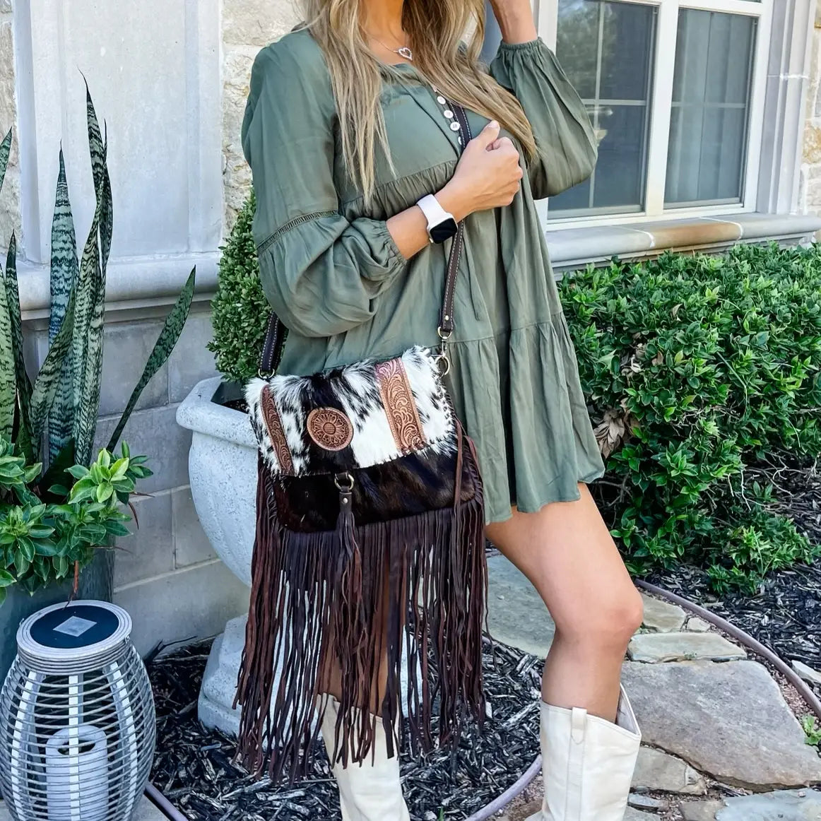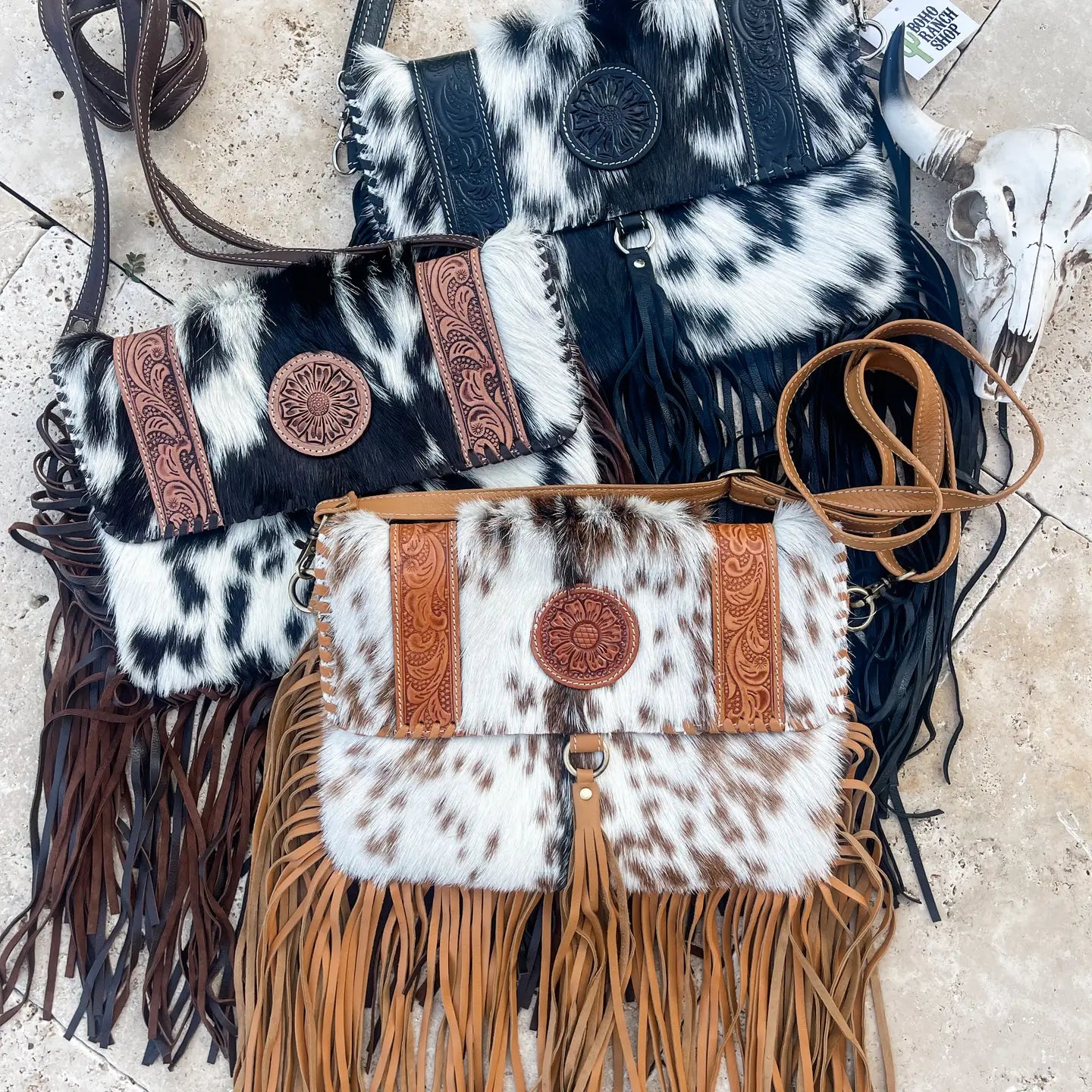 Choose your leather color and we will send you one from that group. Every purse is one of a kind. Please note that this is real cowhide and leather and there can be small defects.
